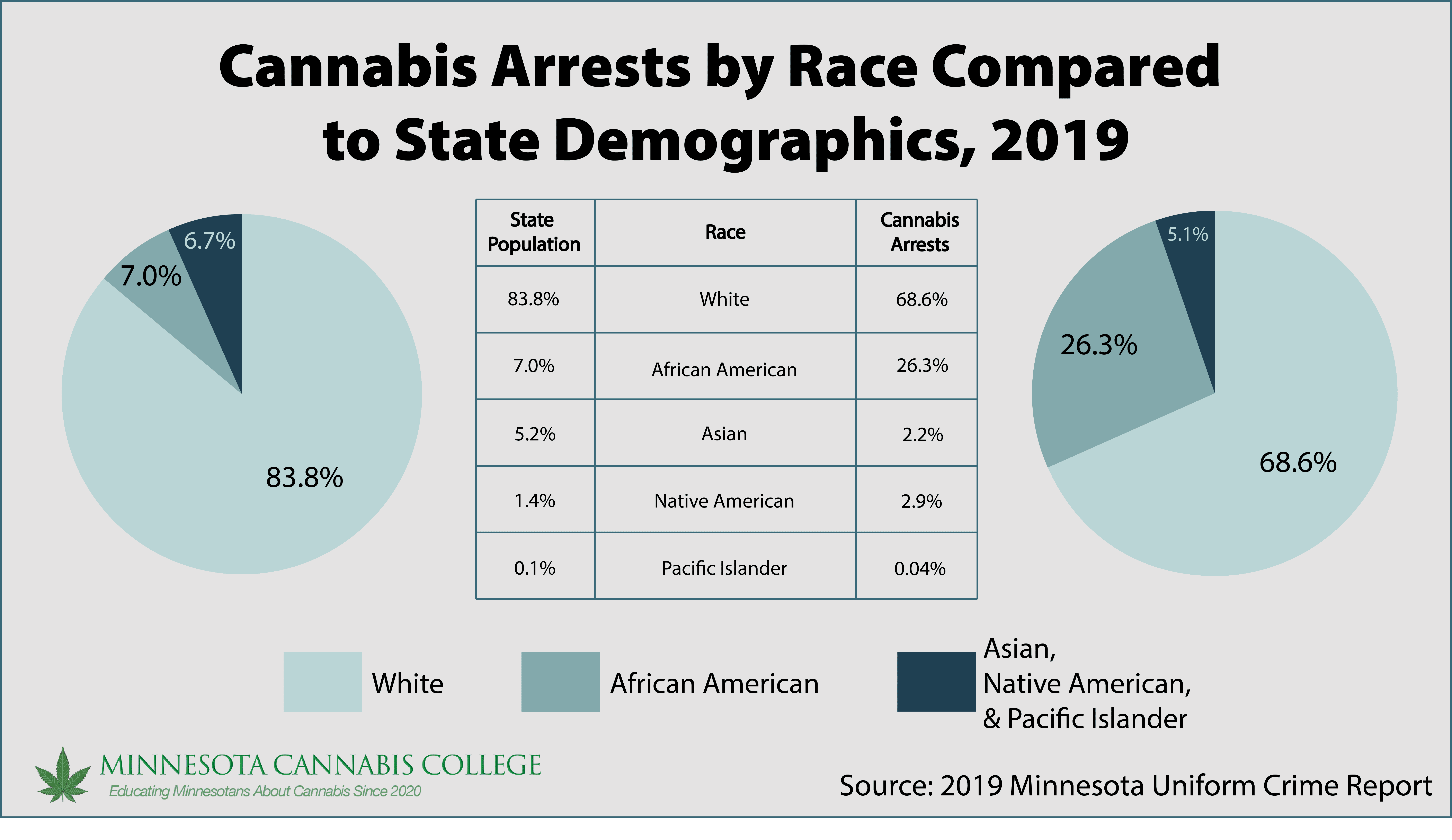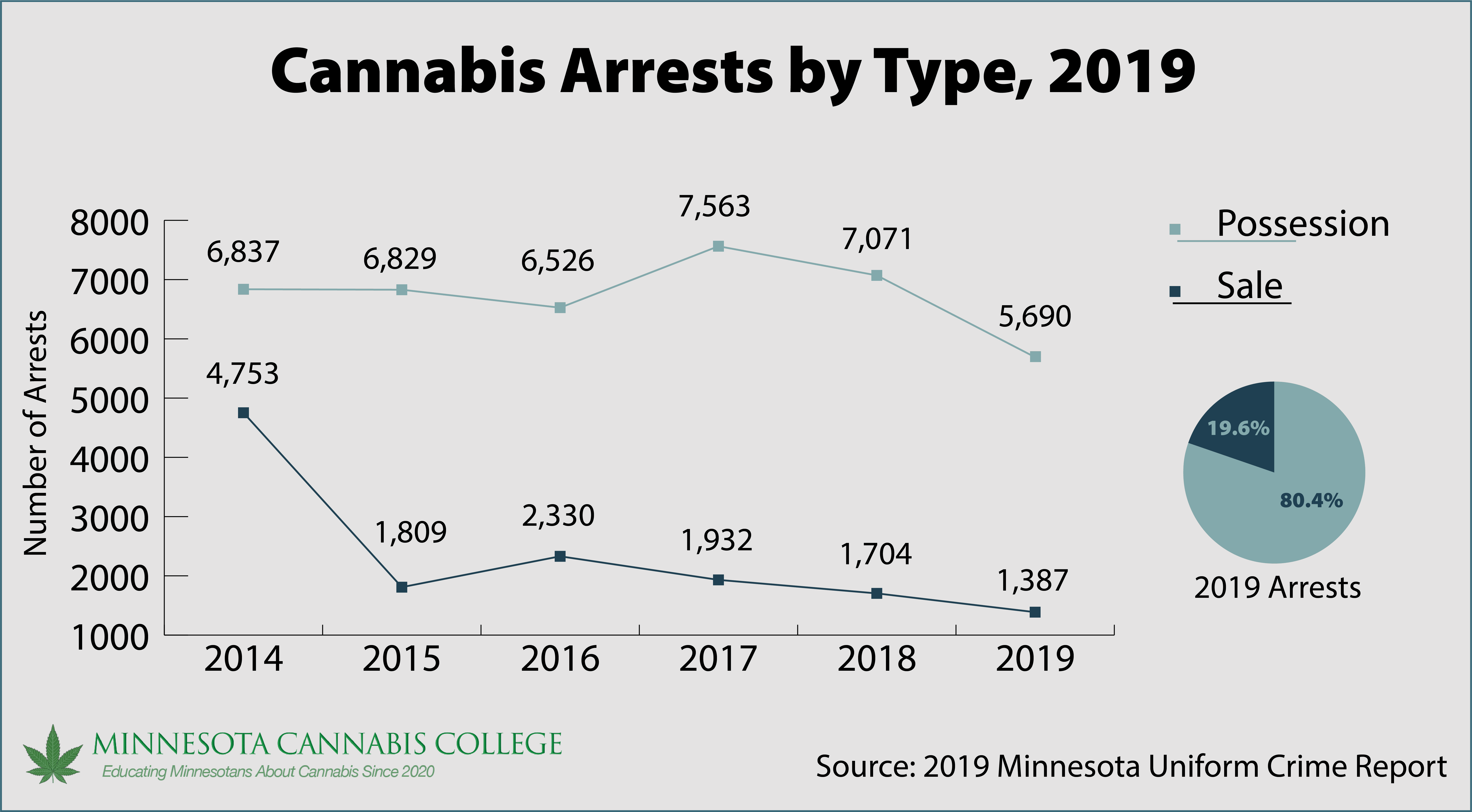- More than TWICE as many Minnesotans were arrested in 2000 than in 2019 for cannabis-related offenses. (16,113 arrests in 2000 vs. 7077 in 2019)