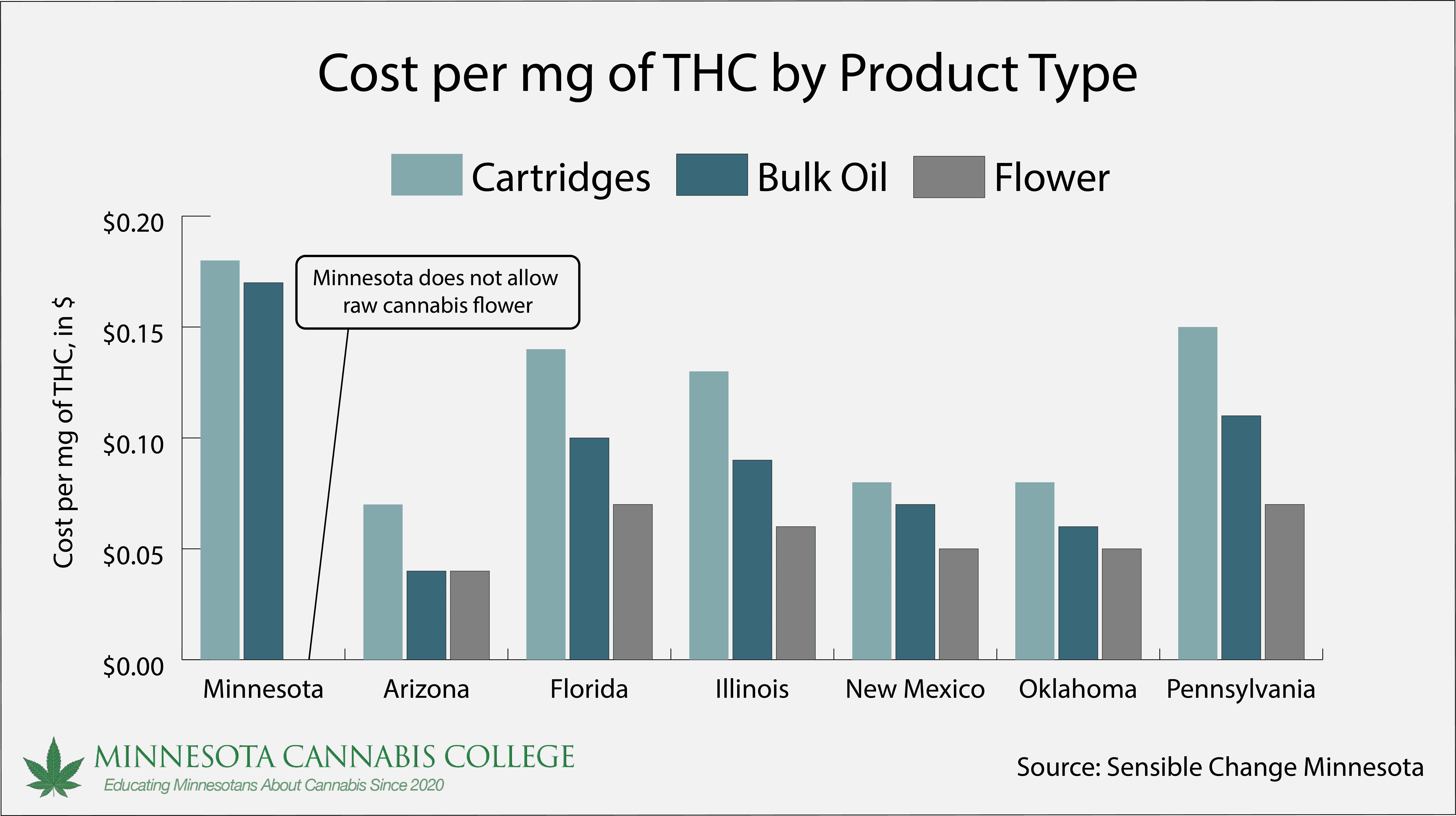 Not only does Minnesota have one of the most restrictive medical cannabis programs in the country, it also has one of the most expensive. Looking at the cost per mg THC shows that patients in Minnesota are paying upwards to four times as much for similar products. A Minnesota cannabis patient would pay $0.18/mg THC in a vaporizer cartridge while a patient in Arizona would pay $0.07/mg THC. The above chart also includes raw flower $ cost per mg of THC, which is substantially lower (AZ is $0.04/mg THC). Unfortunately, Minnesota’s program does not allow patients access to raw cannabis flower.