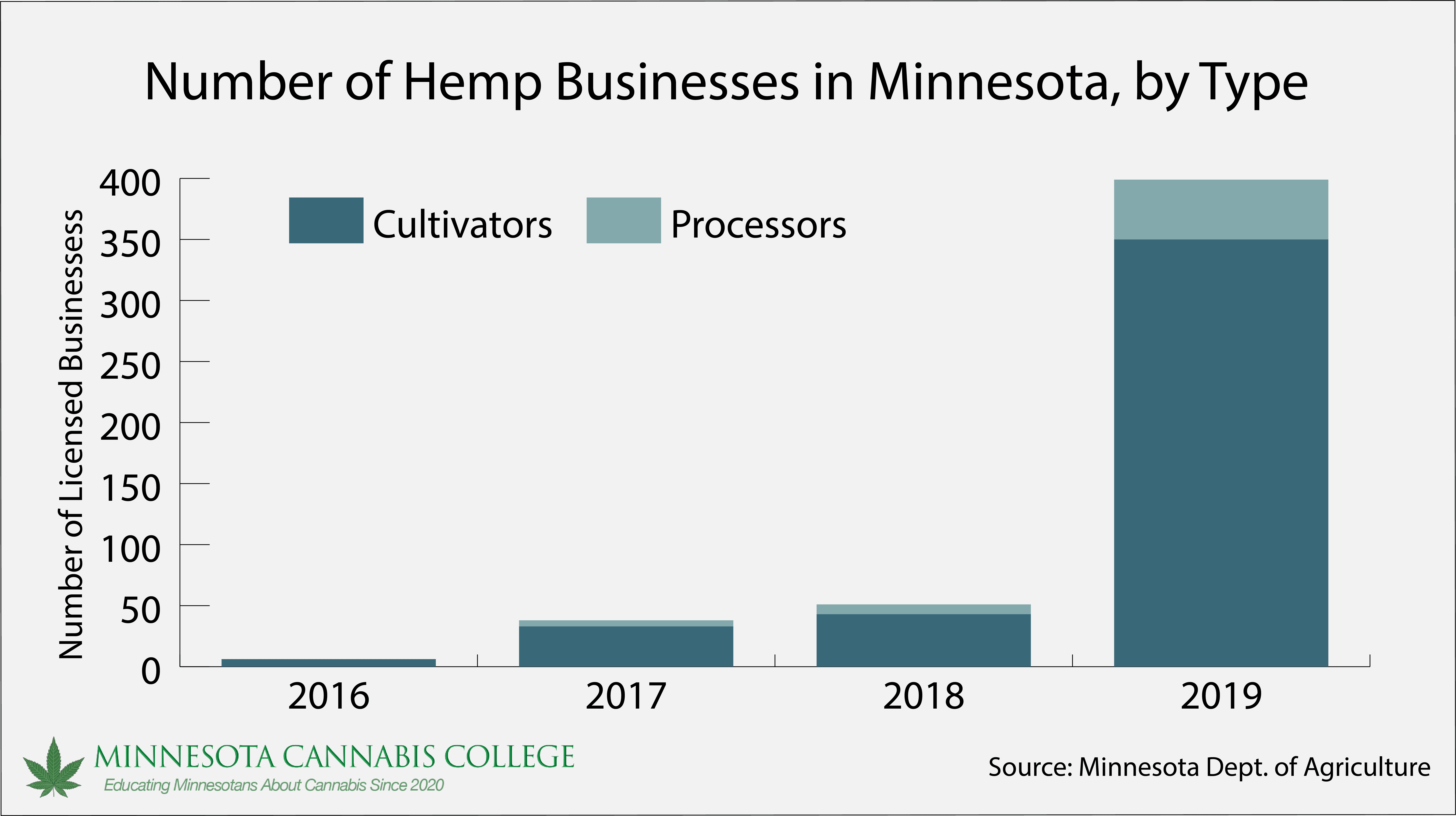 Since the passage of the 2018 Farm Bill, Minnesota’s hemp industry has significantly expanded, going from 51 licensed businesses to 399 in one year. A larger portion of the hemp industry is processors today than in the past. In 2019, over 7,000 acres of hemp was planted (along with over 400,000 square footage of indoor grow space). CBD oil and other hemp-derived products continue to be popular in the state and around the country, so it’s likely that we’ll see a continual growth in the number of cultivators and processors reported at the end of 2020.