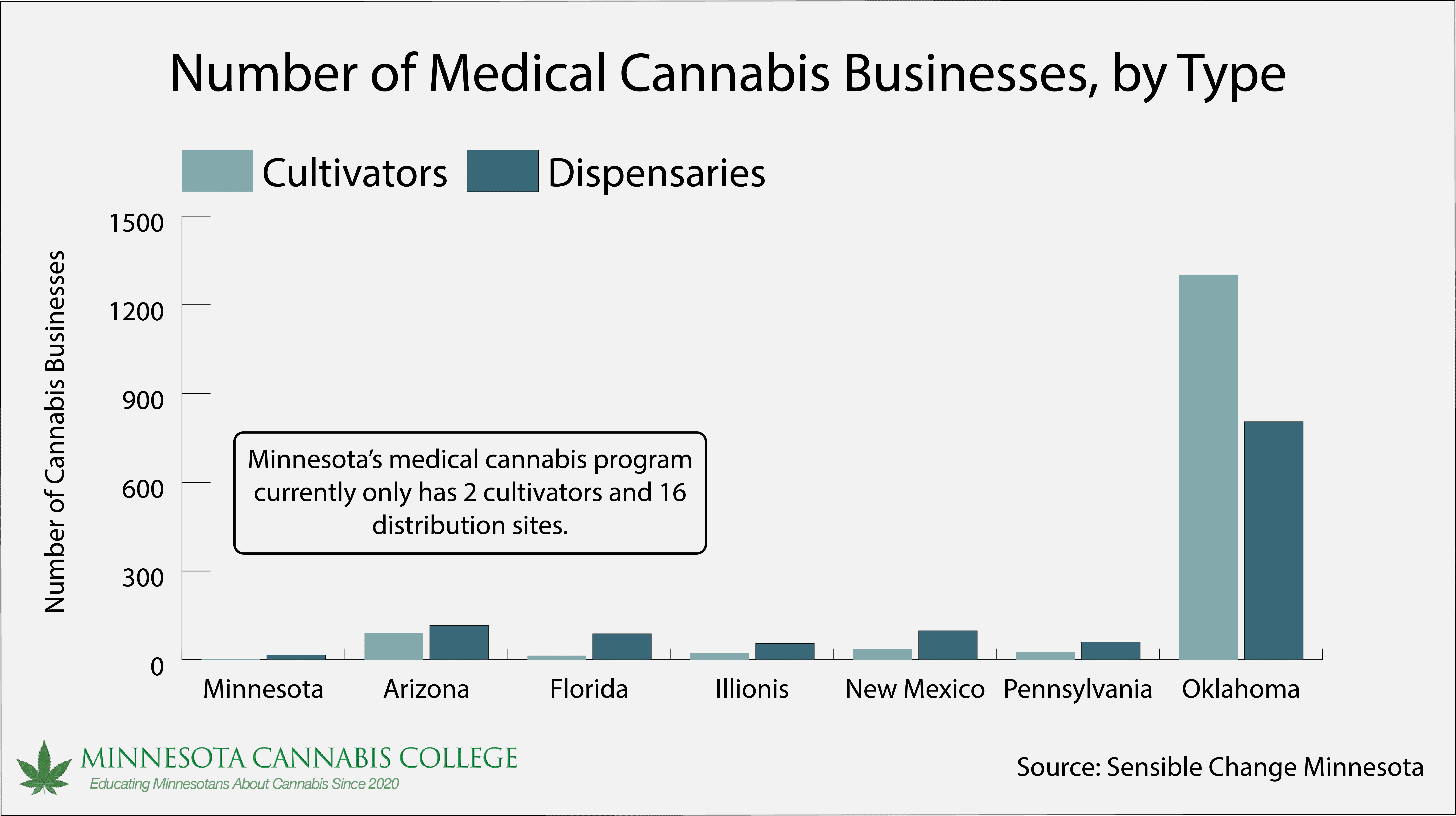 Minnesota currently has two medical cannabis businesses, Leafline Labs and Minnesota Medical Solutions. Each manufacturer can have up to 8 distribution sites spread throughout the state. The chart above compares Minnesota to other similar states, per a Sensible Change MN report. Minnesota’s program is dwarfed by the number of businesses in states such as Arizona, Florida, and Oklahoma.