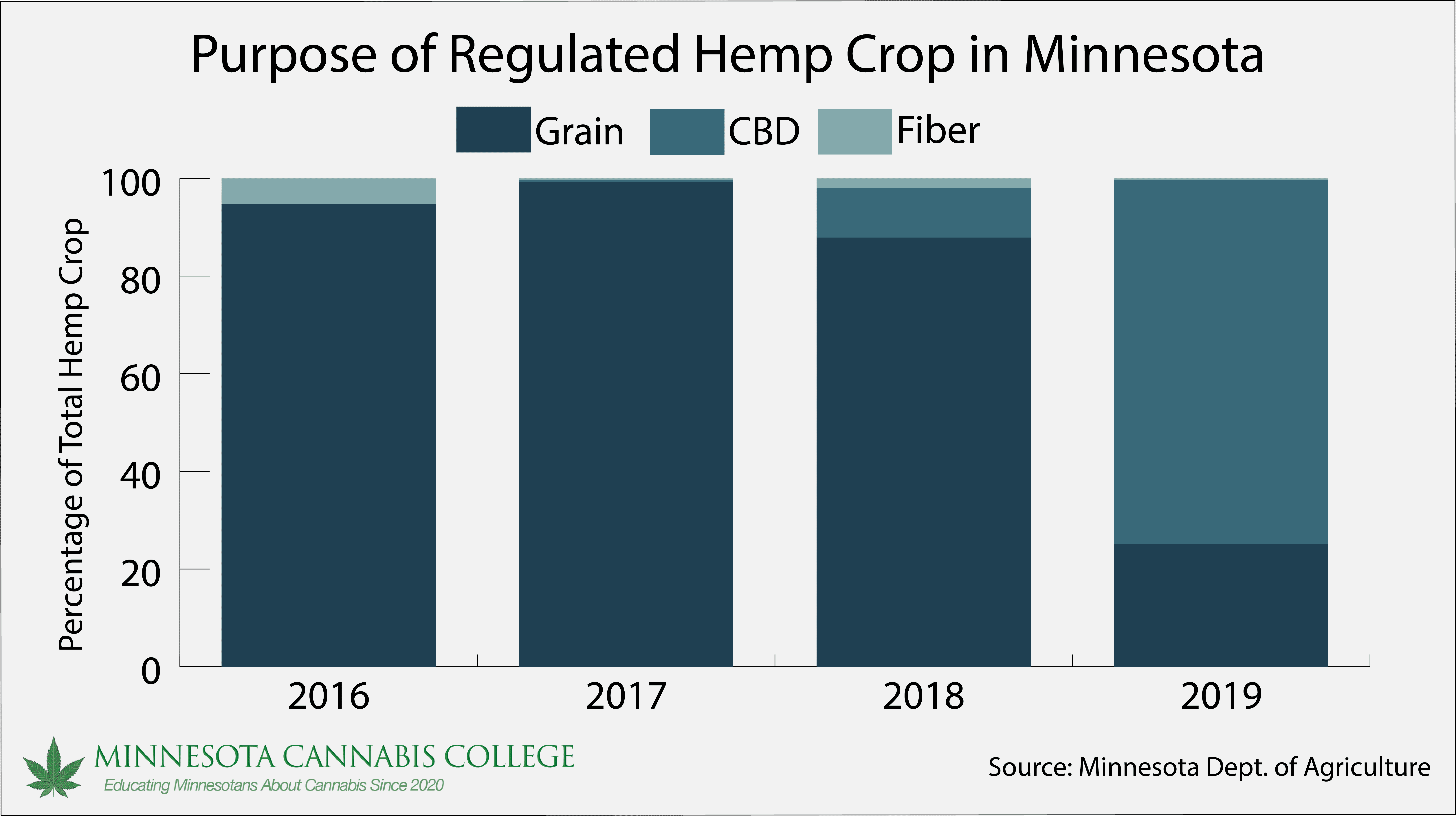 Minnesota’s hemp industry today is primarily for cannabidiol (CBD) and other cannabinoids, but that wasn’t always the case. 2019 (and partially 2018) saw a huge jump in the number of cultivators growing hemp for CBD. In 2017, 0.4% of the crop in Minnesota was for CBD whereas in 2019, that number was 74.4%. Farmers throughout the state continue to explore strains high in other lesser known cannabinoids, such as cannabigerol (CBG) and cannabinol (CBN).